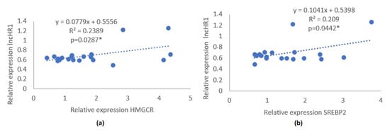 Dispersion diagrams to illustrate the correlation of expression of the genes (a) HMGCR and (b) SREBP2, associated with the pharmacodynamics of statins, and the downregulated lncRNA lncHR1 in hypercholesterolemic patients after treatment with atorvastatin 20 mg/day/4 weeks. Correlation results obtained by simple linear regression analysis. The line represents the trend line of the data obtained from the correlation of the evaluated genes. The points cor-respond to each of the gene pairs (x value and its respective y value). The asterisk (*) represents significant p value obtained from the analysis of variance.