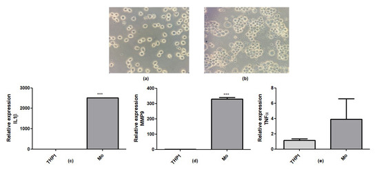 THP-1 is differentiated to Mo macrophages by using 50 ng/mL of PMA for 48 h. Morphology of (a) Monocytic THP-1, (b) THP-1 differentiated to Mo macrophage. Cell size and granularity are shown in photographs taken through an Olympus CKX41 inverted microscope (objective 40X). Gene expression of (c) IL1-β, (d) MMP-9 and (e) TNF-α. RT-qPCR was normalised by RPL-27 reference gene. The bars represent the mean expression for each group ± standard deviation. p-value obtained by Student’s t-test. THP-1: monocytic cells; Mo: macrophage derived from THP-1. *** p < 0.0001.