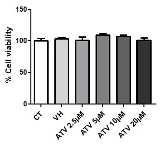 The viability of the THP-1 cell line differentiated to Mo macrophages in the presence and absence of atorvastatin during 24 h of treatment was assessed in concentrations of 0 (vehicle and control); 2.5; 5; 10 and 20 µM (Figure 6). Treatment of the cells with atorvastatin at the concentrations tested showed an acceptable range of cell viability (>90%).