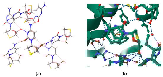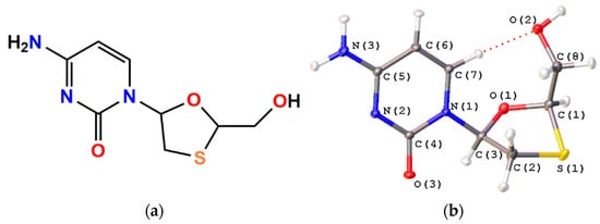 Nucleoside inhibitors of reverse transcriptase (NIRTs) are a great family of drugs for antiretroviral therapy for HIV. Among them, Lamivudine (the commonly adopted name is 3TC) is an old and widely used medication agent for the treatment of both HIV-1 [1] and HIV-2 [2]. Besides HIV, the activity of 3TC against hepatitis B [2] has been demonstrated. From a structural point of view, Lamivudine, as with most NIRTs, consists of the heterocyclic planar dihydroxypirimidine-2-one fragment and a modified cytidine (3-thiacytidine) moiety (Figure 1a). Both of its main structural parts contain additional donor and acceptor groups that can act as a donor and/or an acceptor of rather strong intermolecular interactions to form hydrogen bonds. In addition, two main structural fragments of 3TC are connected by an ordinary N-C bond, which allows for almost free rotation around this bond, so molecular conformation and shape can vary in order to realize various intermolecular interactions in the solid form or in a complex with the receptor. As a result, the above-mentioned features of 3TC have been utilized in many published articles [3,4,5,6,7,8,9,10,11,12,13,14,15,16,17,18,19,20,21,22,23,24,25,26] describing the preparation and crystal structures of different salts, polymorphs, and cocrystals with various co-formers. In total, the crystal structures of more than sixteen polymorphs, solvatomorphs, salts and cocrystals with various co-formers have been described up to date. On the contrary, in ligand–receptor complexes, 3TC is presented as Lamivudine triphosphate (3TC-3TP) almost everywhere, and there is only one example of a complex with protein where 3TC exists in its native chemically unmodified form.