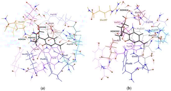 It is unsurprising that the value of the binding energies (−394.7 and −325.7 kJ/mol, respectively, for complexes A and B) exceeds that for the lattice energy of the 3TC tetragonal polymorph by 17 and 32%. The contributions of all the above-mentioned interactions to binding energy between 3TC and deoxycytidine kinase are shown in Figure 6a. The contribution of the O…H interactions due to the presence of strong N-H…O and O-H…O bonds (64 and 71% for complexes A and B, respectively) prevails over other types of interatomic interactions. Cumulative contributions of hydrophile H…O and N…H interactions in complexes A and B to binding energy are equal to 89 and 88%, correspondingly, so hydrophobic interactions of any type are responsible for only 11–12% of the binding energy (Figure 6). The integration of atomic basins and subsequent AIM calculation of atomic charges allows us to estimate the extent of charge transfer between 3TC and its environment. Despite the presence of strong hydrogen bonds and interactions with other types, the overall charge of the 3TC molecule becomes slightly positive (0.043 and 0.025 e). Most probably, the income of charge density caused by intermolecular interactions formed by sulfur atoms and negatively charged atoms of dihydroxypirimidine-2-one moiety almost compensates the charge density outcome due to the H-bonds between methylene, hydroxyl, and amine groups and surrounding electron-withdrawing atoms of water molecules and amino acid residues.