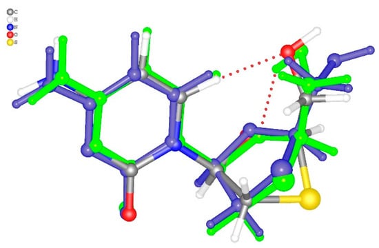 The superimposed structures of 3TC in crystal, complex A (blue color) and complex B (green color). Intermolecular C-H…O and O-H…O bonds are shown by the red dotted lines.
