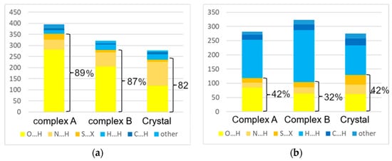 First of all, it should be mentioned that, within the Voronoi tessellation, there are bonding, non-bonding, and forced contacts for the molecular surface. Thus, besides bonding interactions revealed within the AIM approach, some surface goes to N…O, O…O, and S…N interactions, although their contribution to the total molecular surface is very low (Table S3). Another important difference between the results of the Voronoi tessellation and the AIM theory is that the contribution of hydrophilic interactions to the molecular surface is nearly two times lower (c.a. 40% vs. 85%) than the contribution to the sum energy of molecular interactions. This fact results from an equal division of crystal space between two atoms with non-equivalent electronegativity in the Voronoi approach. In fact, a zero-flux surface is shifted to one of them. Besides, for complex B with elongated interatomic distances and probably voids with missing atoms and groups of atoms, the results of the Voronoi tessellation are not highly reliable—this can explain both the enlarged molecular volume and surface, and the fact that two bcps in this complex correspond to non-direct interactions. Nevertheless, some regularities concerning the role of different types of interactions remain common for both models: (i) the contribution of the hydrophilic interactions to the molecular surface remains nearly constant (for complex A and crystal), (ii) the contribution of the H…O interactions to the molecular surface and sum energy is higher than that of H…N interactions, and in ligand–receptor complexes the former are more frequently observed.