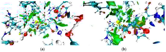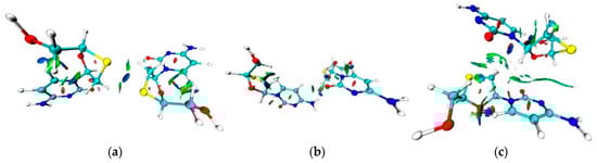 Similarly, the analysis of RDG function for the crystalline complexes A and B clearly demonstrates the attractive character for almost all strong O-H…O and N-H…O bonds (Figure 8 and Figure 9). The first of two exceptions is a strong O-H…O bond between the hydroxyl group of 3TC and COO- moiety of glutamine residue while the second is an intramolecular O-H…O bond in 3TC. The corresponding maxima of RDG function are characterized by the presence of regions with positive values of λ2 (red color). The reason can be related to steric repulsion between negatively charged oxygen atoms. The stacking, C-H…π, O-H…S and C-H…S interaction can be characterized as van-der-Waals interactions. Despite rather high surface areas, they are characterized by values of λ2 that are close to zero. The character of O-H…S and C-H…S interactions formed by 3TC differ considerably from those formed by sulfur atoms of cysteine. In the latter case, almost all bonds can be characterized as attractive ones [55].