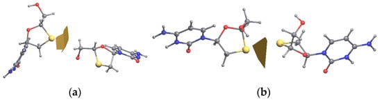 For analysis of molecular Voronoi polyhedra, crystal structures of solids containing 3TC and H3TC+ were taken from the CSD, provided that there was no disorder for any of the atoms. The list of 19 solids is given in Appendix A. For these compounds, as well as for the optimized complexes A and B, the molecular Voronoi surfaces were analyzed, taking the coordinates of hydrogen atoms into account. For comparison with the ligand–receptor complexes containing 3TC and 3TC-TP, crystal structures from the PDB were taken (listed in Appendix A), and the coordinates of hydrogen atoms were added using the Hermes package [50]. Analyses of molecular Voronoi polyhedra, their volumes, and surfaces were carried out by means of the ToposPro package [51].