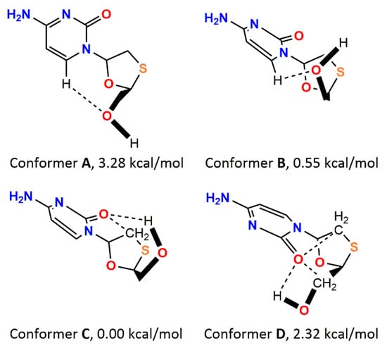 Schematic representation of intramolecular C-H…O and O-H…O interactions (dashed) in four stable conformations of 3TC, and their relative energies as obtained in ref. [29].