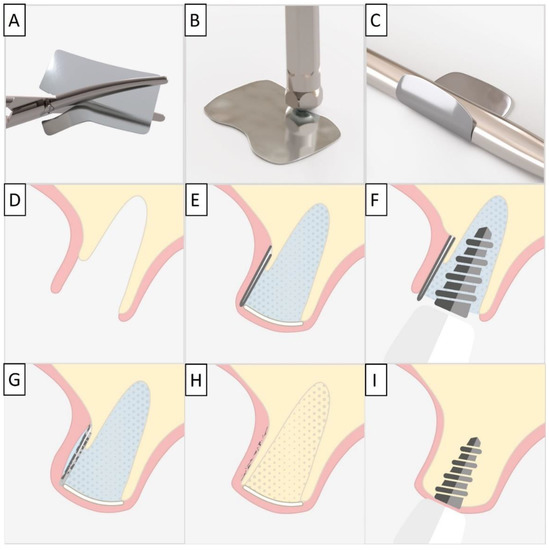 For the magnesium shield technique, the magnesium membrane is first cut to shape using the NOVAMag® scissors (A). The rim of the membrane is then flattened using the NOVAMag® sculpture (B) and bent into shape (C). In a compromised extraction socket (D), the membrane is either place as a single layer or bent into a double layer, before being positioned to rebuild either the buccal or palatal wall. The membrane is held in position by the periosteum and the defect space is filled with the graft material. A collagen membrane is placed on the top of the ridge (E). Using the technique, it is also possible to immediately place implants with a provisional restoration (F). Once implanted, the magnesium membrane will begin to degrade, transforming into magnesium salts that maintain the soft tissue barrier, and hydrogen gas will be released that provides a tenting of the soft tissue, which also extends the barrier effect, since cells cannot cross the gas cavity (G). After the magnesium metal has transformed into magnesium salts, no more gas is released, and the soft tissue returns into position over the newly formed bone and magnesium salts (H). After the critical healing period, the magnesium membrane is completely resorbed (I).