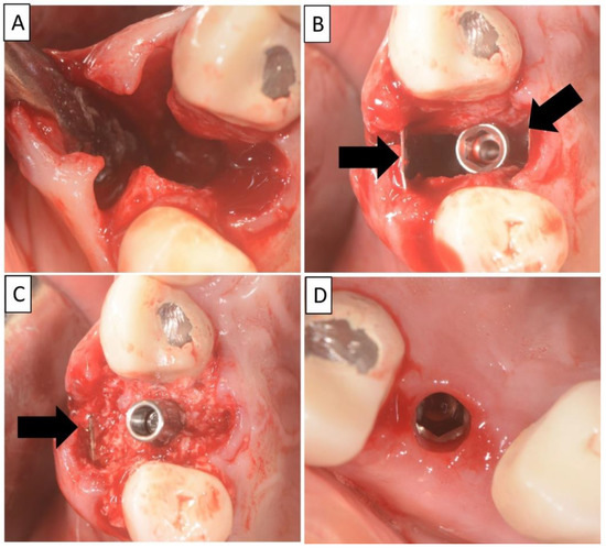 (A) Alveolar socket following atraumatic extraction and curettage. Severe bone loss of both buccal and palatal plates. (B) Buccal and palatial plates were created using the magnesium membrane shield technique. (C) Application of allograft. (D) Four months post operatively there was an excellent regeneration of bone defect, including fully regenerated cortical and palatal plates. The implant was stable and there was a good healing of the soft tissues. Black arrows are used to indicate the position of the magnesium membrane.