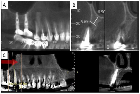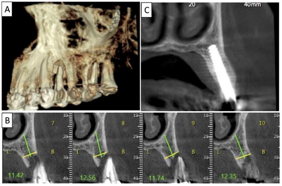 (A) Lateral volumetric cone beam computed tomography (CBCT) shows significant loss of buccal and palatal bone mass around tooth 24. (B) Coronal CBCT slice of the same area of tooth 24 revealing missed buccal and palatal bone and associated apical radiolucency. (C) The coronal CBCT section shows the implant in the area of tooth 24 and the obtained completely regenerated cortical and palatal plates.