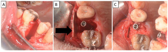(A) Alveolar socket following atraumatic extraction and curettage. Severe bone loss of buccal plate. (B) Buccal plate was created using the magnesium membrane shield technique. (C) Application of allograft together with magnesium membrane. The black arrow indicates the position of the magnesium membrane.