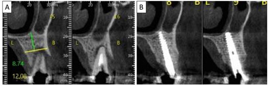 (A) Coronal CBCT section shows tooth 25 with vertical root fracture and destroyed buccal bony wall and intact palatine. (B) The coronal CBCT section shows the placed implant in the region of tooth 25 and the complete regeneration of the cortical wall.