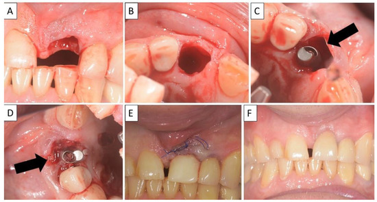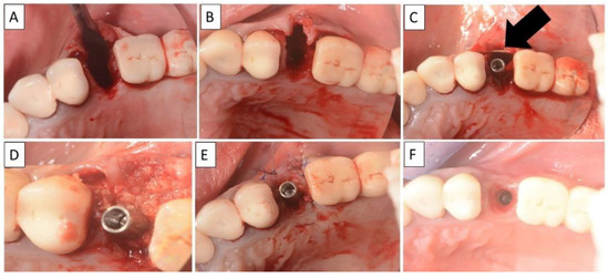 (A,B) Alveolar socket following atraumatic extraction. Severe bone loss of buccal plate. (C) Buccal plate was created using the magnesium membrane double layer technique. (D) Application of allograft. (E) closing sutures and immediate provision. (F) four months postoperatively there was an excellent regeneration of bone defect, including fully regenerated cortical and palatal plates. The implant was stable and there was a good healing of the soft tissues. Black arrows are used to indicate the position of the magnesium membrane.