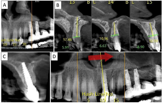 (A) Panoramic CBCT section shows bone loss around tooth 21. (B) Sagittal CBCT section of the area around tooth 21 shows extensive buccal bone loss. (C) A sagittal CBCT section shows the implant placed at site 21 with a restored cortical buccal plate. (D) Panoramic CBCT section shows bone formation around the implant in area 21.