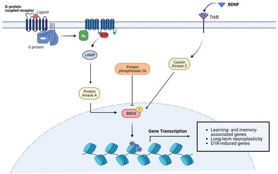 Proposed model for BRD4 activation in neurons. Gs protein-coupled receptors and TrkB activation recruit cAMP/PKA axis and casein kinase 2 (CK2), respectively, promoting BRD4 phosphorylation and subsequent Kac recognition on chromatin. This event results in the transcriptional activation of genes involved in learning and memory, neuroplasticity, as well as upregulation of genes mediated by D1R. Protein phosphatase 2A inhibits BRD4 recruitment to chromatin through dephosphorylation [,,,]. This figure is created with BioRender.