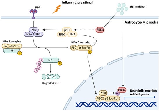 BRD4 interacts with NF-kB to regulate the expression of inflammation-associated genes. Activation of pattern recognition receptors (PPR) by inflammatory stimuli determines IKK α/β/γ complex recruitment resulting in IkB phosphorylation and later degradation through ubiquitin/proteasome-dependent mechanisms. IkB downregulation leads to NF-kB subunit p65/c-Rel phosphorylation by MAPK members (p38, ERK and JNK), promoting its nuclear localization. Nuclear NF-kB binds to target gene promoters recruiting acetyltransferase CBP/p300 complex. p65/c-Rel subunit is later acetylated at Lys310, leading to BRD4 recognition of acetylated NF-kB and upregulation of genes involved in neuroinflammation. BET inhibitors exert anti-inflammatory effects by preventing BRD4 binding to acetylated NF-kB and inhibition of MAPK activation through indirect BRD4-dependent mechanisms in both astrocytes and microglia [,]. This figure is created with BioRender.