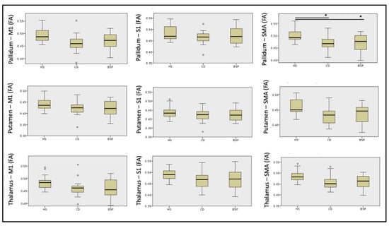 | PALLIDUM—SMA Mean (SD) | 0.504 (0.03) | 0.468 (0.03) | 0.469 (0.03) | 0.005 | 10.74 | HS-BSP p = 0.026 |