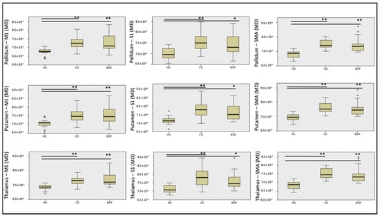 | THALAMUS—M1 Mean (SD) | 0.001068 (0.000024) | 0.001122 (0.000028) | 0.001124 (0.000046) | <0.0001 | 23.93 | HS-BSP p < 0.0001 |