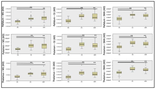 | THALAMUS—S1 Mean (SD) | 0.00071 (0.00002) | 0.00078 (0.00005) | 0.00076 (0.00005) | <0.0001 | 18.25 | HS-BSP p = 0.006 |