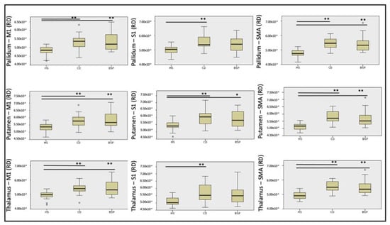 | PUTAMEN—SMA Mean (SD) | 0.00070 (0.00003) | 0.00076 (0.00004) | 0.00076 (0.00005) | <0.0001 | 24.71 | HS-BSP p < 0.0001 |