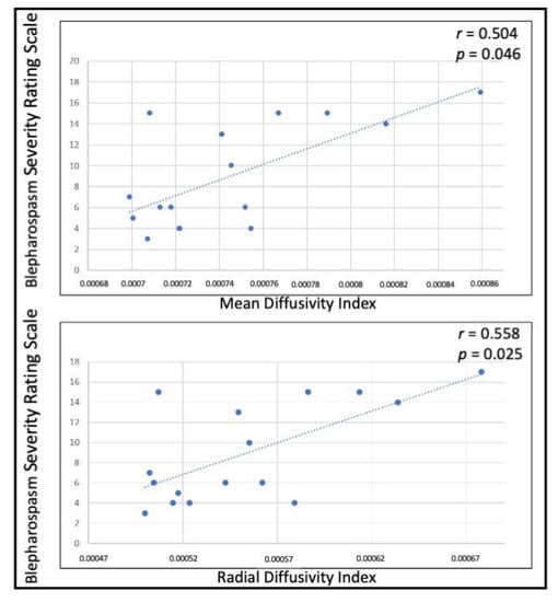 - Yang, J.; Luo, C.; Song, W.; Guo, X.; Zhao, B.; Chen, X.; Huang, X.; Gong, Q.; Shang, H.-F. Diffusion Tensor Imaging in Blepharospasm and Blepharospasm-Oromandibular Dystonia. J. Neurol. 2014, 261, 1413–1424. [Google Scholar] [CrossRef] [PubMed]
