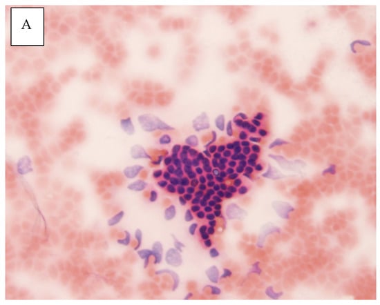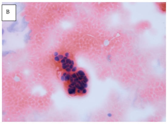 After macroscopic evaluation of the samples, smeared microscopic slides were fixed in 96% ethanol. For the cytological evaluation, the smear was stained with May–Grünwald/Giemsa–Romanovsky and hematoxylin–eosin. Specimens were then analyzed by pathologists as a part of the standard clinical procedures. The six-tiered standardized terminology and nomenclature for pancreatobiliary cytology proposed by the Papanicolaou Society (PAP categories I: non-diagnostic, II: negative for malignancy, III: atypical, IV: neoplastic benign or other, V: suspicious for malignancy, VI: positive for malignant) were used []. For purposes of the study, PAP categories V and VI were considered as positive for malignancy while the categories I, II, III, or IV were regarded as nonmalignant. (Figure 1A,B).