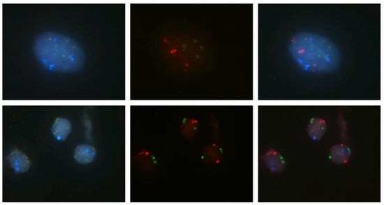 FISH is a molecular cytogenetic method based on the detection of fluorescently labeled specific DNA/RNA sequences of chromosomes with a high degree of sequence complementarity []. Typically, it enables the detection of various types of cytogenetic alterations (including aneusomy, aneuploidy, deletion, translocation, among others) for well-defined chromosomes in patients with suspected malignancies. In our study, FISH was performed using the ZytoLight FISH probes targeting chromosomes 3, 7, 17, and 9p21, which are the same chromosomes as those targeted by UroVysion probes used in other studies [,,,]. Even though these ZytoLight FISH probes were initially developed for the diagnosis of other neoplasms, such as hematologic, breast, lung, or urinary bladder cancers [], our study showed that they could also be effective for the diagnostics of pancreatobiliary malignancies. Combined with routine cytology, they showed an improving sensitivity in the primary diagnosis of biliary strictures when compared to BC alone (p = 0.076). Although a set of probes (targeting the chromosomes 1q21, 7p12, 8q24, and 9p21) designed for pancreatobiliary malignancy and with 93% sensitivity and 100% specificity has recently been developed [], it is not yet commercially available.