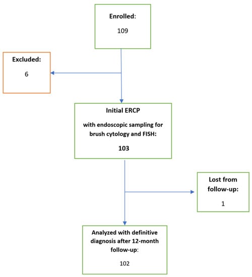 In total, 109 consecutive patients were enrolled in the study during the study period. Six patients with an already known diagnosis of primary sclerosing cholangitis (PSC) without suspicion of malignancy were excluded and one patient was lost from the follow-up (Figure 3). As a result, a total of 102 patients, including 62 (60.8%) males and mean age 67.4 (range 25–92) years, were subjected to final analysis. The demographic data of the patients and their definitive diagnosis are presented in Table 1 and Table 2. In 22 (21% of) cases, the strictures had to be dilated to enable the brushing. The sampling was judged macroscopically as successful in all cases. There were no lethal or severe complications related to the study methods. A total of three (2.8%) patients developed mild PEP.