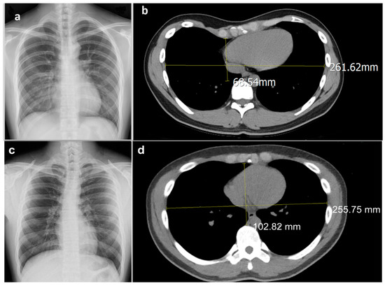 Pectus excavatum is diagnosed by Haller index > 3.25. Calculation of Haller index by measurement of SVD (sternual-vertebral distance) divided by TD (transverse chest diameter) from chest computed tomography (CT). Sample images used in our study: (a) posteroanterior-view chest X-ray of a 24-year-old patient with PE with (b) CT calculated Haller index of 3.82. (c) Posteroanterior-view chest X-ray of a 24-year-old patient with no abnormal radiographic finding with (d) CT calculated Haller index of 2.49.