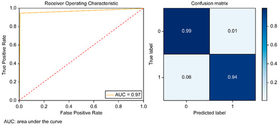 As previously mentioned, our model was implemented using Xception, a standard network architecture in the Keras deep learning library [14]. We set early stopping in our script code, wherein the training process is stopped if there is no improvement in accuracy after three epochs. The highest accuracy for the model, evaluated on the test set, was realized after 28 epochs on the training set. The test set used for evaluating the performance of our model was not used previously during the training process. The confusion matrix indicating our model performance is shown in Figure 3, with an accuracy of 0.973 ± 0.005, precision of 0.986, recall of 0.943, F1-score of 0.964 and AUC of 0.976 ± 0.014 (Table 3; Figure 4) [16].