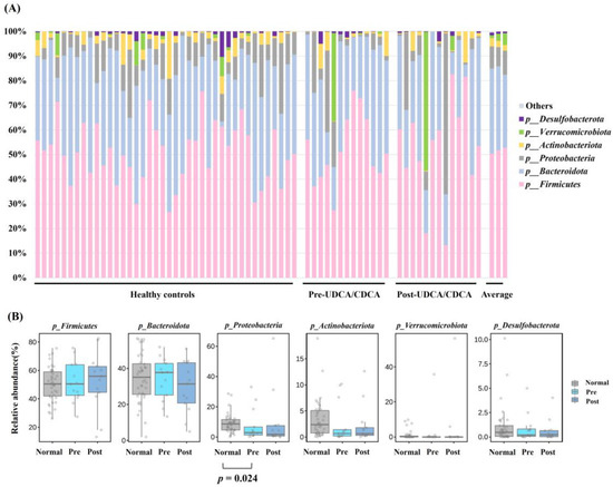We analyzed taxonomic compositions and alterations in the gut microbiome in GB stone patients over the 6-month treatment period and compared compositions with those of healthy controls. The compositions and abundances of bacterial communities in the healthy controls and pre- and post-UDCA/CDCA treatment groups at the phylum level are shown in Figure 1A,B. The phyla Fimicutes, Bacteroidota, Proteobacteria, Actinobacteriota, Verrucomicrobiota, and Desulfobacteriota were enriched in all three groups, and, as shown by the figures, relative abundances were similar in the groups. However, aggregate data showed significant differences between gut microbial compositions at the phylum level between the pre-UDCA/CDCA group and healthy controls (Figure 1B). Furthermore, a significantly lower relative abundance of the Proteobacteria phylum was observed in the pre-UDCA/CDCA group than in the control group (p = 0.024). Phyla that accounted for <1% of microbiomes were designated ‘others’.