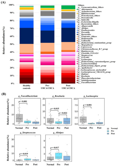 Interestingly, the abundance of Roseburia was lower in the pre-UDCA/CDCA group than in the control group (p = 0.015) but recovered in the post-UDCA/CDCA group (p = 0.022) to a level similar to that of the control group (Figure 2B).