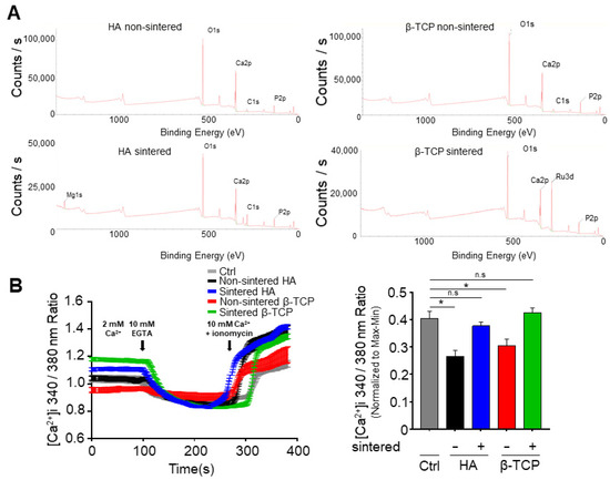 (A) X-ray photoelectron spectroscopy (XPS) spectra of sintered and non-sintered HA and β-TCP; (B) Intracellular calcium measurements from cells incubated with the sintered and non-sintered bioceramics. The bar graph shows values presented as a mean ± the standard error of the mean (SEM.). The values were also normalized to those of the control sample. The results were compared using the one-way analysis of variance (ANOVA) method. * p < 0.05; n.s = not significant.