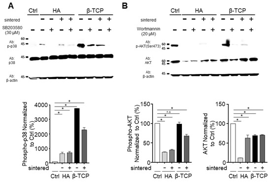 Western blotting measurements examining the p38 and AKT pathways of MG63 cells after exposure to the sintered and non-sintered bioceramics: (A) p38/p-p38; (B) AKT/p-AKT. The bar graphs show values presented as the mean ± the SEM., which have been normalized to the control samples in each case. The results were compared using the one-way ANOVA method. * p < 0.05; n.s = not significant.