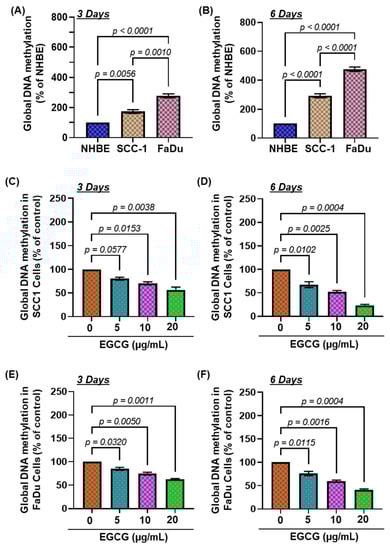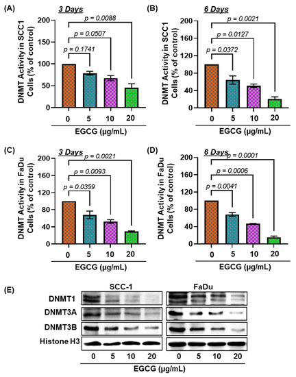 Next, to determine whether EGCG inhibits DNA hypermethylation in HNSCC cell lines, SCC-1 and FaDu cells were treated with EGCG dose- (0, 5, 10, and 20 µg/mL) and time-dependently for 3 and 6 days. After incubation with EGCG for the duration, cells were harvested and subjected to nuclear fractionation, and the levels of global DNA methylation were measured by ELISA. As shown in Figure 1C,D, The EGCG treatment to SCC-1 cells significantly decreased the global DNA hypermethylation, ranging from 20–43% after 3 days (F(3,4) = 24.99, p < 0.005) and 33–76% (F(3,4) = 78.81, p < 0.0005) after 6 days, compared with untreated cells. The inhibitory effect of EGCG on DNA hypermethylation was also similarly observed in the FaDu cells (Figure 1E,F). In comparison with the untreated group, the levels of DNA hypermethylation were greatly decreased in FaDu cells, up to 15–33% (F(3,4) = 48.39, p < 0.002) and 24–59% (F(3,4) = 84.99, p < 0.0004) after 3 days and 6 days, respectively. The inhibitory effect of EGCG on DNA hypermethylation was greater after 6 days of treatment. Our data suggest that inhibition of DNA hypermethylation might be a slow process, as the best effect of EGCG was observed after 6 days, therefore samples obtained after 6 days were analyzed for further verification.