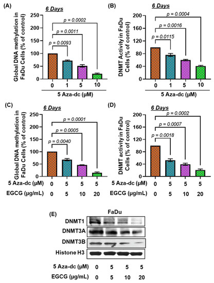 To confirm the inhibitory effect of EGCG on DNA hypermethylation, FaDu cells were further treated with 5Aza-dc alone and in combination with EGCG to assess the effect on DNA hypermethylation, DNMT activity, and DNMT protein expression. After 6 days, the dose and time-dependent application of 5Aza-dc to FaDu cells significantly reduced DNA hypermethylation up to 79.38% F(3,4) = 128.8, p = 0.0002) and DNMT activity up to 58.76% F(3,4) = 85.12, p = 0.0004) compared with the untreated cohort (Figure 4A,B).