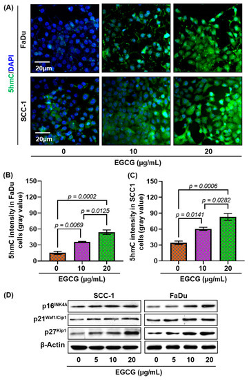 Effects of EGCG on DNA demethylation in HNSCC cells. SCC-1 and FaDu cells were treated with various concentrations of EGCG (10 and 20 μg/mL) for 6 days, and DNA demethylation was analyzed by immunostaining of 5-hydroxymethylcytosine (5hmC). Representative images of 5hmC staining (green) in FaDu and SCC-1 cells (A). The expression of 5hmC was quantified by ImageJ software and presented as mean gray value intensity ± S.E.M (B,C). A significant difference was observed versus non-EGCG-treated controls. EGCG treatment increased the expression of p16INK4a, p21Waf1/Cip1, and p27Kip1 compared with the untreated group (D).