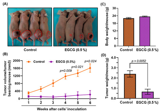 Female BALB/C nude mice (4–5 weeks of age) were purchased from the National Institute of Biologicals (Noida) and housed in the institutional animal resource facility. The mouse colony was maintained under a 12 h dark/12 h light cycle, a temperature of 24 ± 2 °C, and relative humidity of 50 ± 10%. The mice were given a control AIN76A diet with or without supplementation with EGCG (0.5%, w/w) and drinking water ad libitum throughout the experiment. The Institutional Animal Care and Use Committee, approved the animal protocol used in this study, under the animal protocol number 201809267. To determine the in vivo chemotherapeutic effect of EGCG on the growth potential of FaDu cells, 2 × 106 cells (100 µL PBS) were injected subcutaneously in the right flank. One day after the cells’ injection, mice were divided randomly into two groups, 4 mice per group: (i) Control and (ii) EGCG treatment. Control mice were fed an AIN76A diet, while the other group was supplemented with 0.5% EGCG in their pellets throughout the experiment. AIN76A is the normal rodent chow and commercially available. The AIN76A diet maintained a balanced nutritional profile containing protein (18.1%), fat (5.1%), fiber (4.8%), and carbohydrate (65.2%). During the experiment, tumor size was measured weekly using calipers, and tumor volume was calculated by the ellipsoid formula (tumor volume = 1/2(length × width2) [22]. The experiment was terminated after 6 weeks, and tumor and body weights were recorded. At the end of the experiment, mice were euthanized with CO2 gas inhalation followed by cervical dislocation. Tumor tissues were collected and fractioned for protein estimation and histochemistry and stored at −20 °C until further analysis. The dietary dose of 0.5% EGCG is equivalent to 5 mg/mouse/day, assuming that a mouse of bodyweight 25.0 gm eats 5 g of chow [23]. Based on the mouse dose and formula by Nair et al., the human equivalent dose (HED) of 0.5% EGCG (w/w) would be approximately 189.18 mg/day [24].
