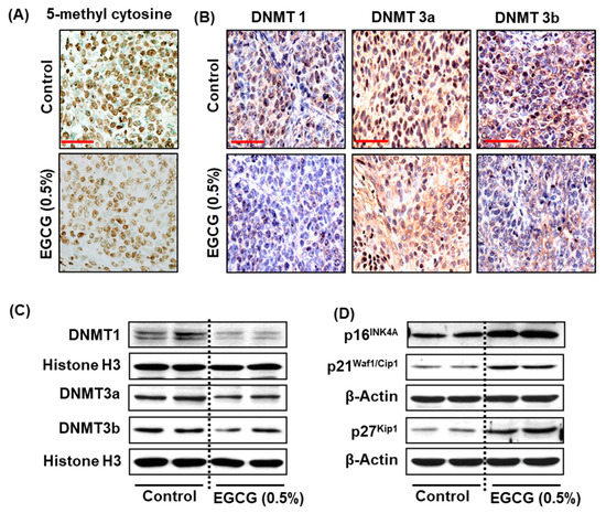 Next, we determined the effect of EGCG on DNA methylation and DNMT1, DNMT3a, and DNMT3b expression in tumor tissues. The expression of 5-mc (Figure 7A) and all three DNMT proteins (Figure 7B) was reduced in EGCG-treated mice, as reflected in less nuclear expression compared with non-EGCG-treated mice. The reduced expression of DNMT1, DNMT3a, and DNMT3b was also confirmed by Western blot analysis (Figure 7C). To verify the data obtained from cell culture studies, we also determined the effect of EGCG on tumor suppressor proteins by Western blotting in the tumors. Western blot analysis demonstrated that EGCG treatment reactivated silenced tumor suppressor proteins on p16INK4a, p21Waf1/Cip1, and p27Kip1 expression in the tumors, compared with tumors obtained from untreated mice (Figure 7D). These results further suggest that increased p16INK4a, p21Waf1/Cip1, and p27Kip1 expression blocks the cell cycle and ultimately contributes to the suppression of tumor growth in FaDu tumor xenografts.