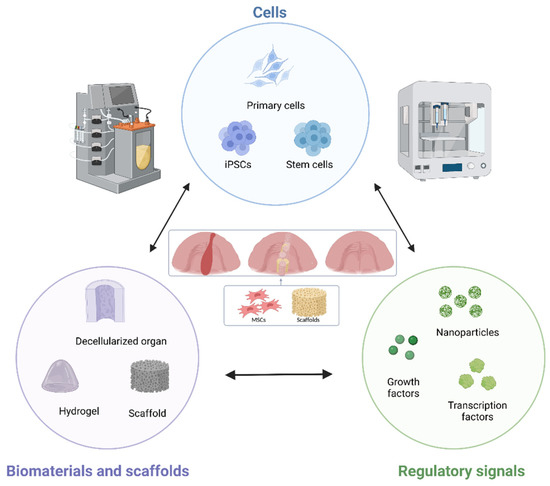 The essential components of tissue engineering in dentofacial malformations (cleft palate, hemifacial microsomia); stem cells, scaffolds, and regulatory signals, including GFs.