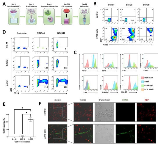 Dendritic cells (DCs) have traditionally been used as antigen-presenting cells. However, using DCs can be burdensome as it requires the isolation of immature DCs from peripheral blood mononuclear cells (PBMCs) each time, induction of differentiation into mature DCs, and supplementation of CD14 and GM-CSF for cell growth. In contrast, immortalized B cells provide an unlimited, “ready-to-use” resource that does not require induction for maturation. Previous research has shown that the expression of oncogene BCL-6 is able to inhibit B-cell differentiation into plasma cells and that BCL-6 transduced cell lines can express a phenotype consistent with germinal center B cells []. Another anti-apoptotic oncogene, BCL-XL, when co-expressed in BCL-6 transduced B cells, can exert a remarkable effect in prolonging the cell proliferation and preventing cell death, particularly in response to CD40 stimulation []. To establish our immortalized B cells, B cells were isolated from normal healthy donor (ND) PBMCs and transfected with retrovirus expressing BCL-6 and BCL-XL genes, as well as GFP reporter gene. The transfected B cells were cultured with genetically engineered fibroblastic BJ (feeder) cells expressing CD40L and secreting IL-21 (Figure 1A,F and Supplementary Figure S1A), which have been shown to strongly induce B-cell proliferation [,]. The B cells in expansion were subject to flow cytometric analysis for observation of CD19+GFP+ immortalized cell frequency changes. Cells that were CD19+GFP+ increased in frequency to around 30% of the culture at day 14, and to about 60% of the culture at day 21, after which the CD19+GFP+ cells were isolated via cell sorting technique (Figure 1B and Supplementary Figure S1B). We observed varied frequencies of CD19+GFP+ cells in B cells from different NDs after 14-day and 21-day expansion periods (Supplementary Figure S1C), indicating the impact of intrinsic qualities of B cells on cell immortalization. With expansion and activation signals from CD40L and IL-21 provided by the feeder cells, flow cytometric analysis of the immortalized B cells showed that they expressed CD19, HLA-ABC, and HLA-DR, and highly express the activation markers CD40, CD80, CD83, and CD86 (Figure 1C and Supplementary Figure S1D). To test the optimal cell quantity for B-cell immortalization, different quantities (respectively 0.1, 0.25 and 0.5 × 106) of B cells isolated from PBMCs of two NDs were immortalized, with GFP and CD19 expression analyzed via flow cytometry at day 10. We observed a clearly improved retroviral transduction and GFP and CD19 expression with at least 0.5 × 106 B cells as the input cell quantity (Figure 1E).