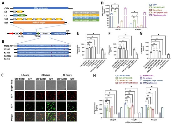 The vector template was used for the generation of RNA encoding CMVpp65, CMV-MITD-WT, Nef-MITD-WT, S2-MITD-WT, L2-MITD-WT, S10-MITD-WT, CMV-MITD-S335E, CMV-MITD-Y320E, and CMV-MITD-S335E/Y320E for in vitro transcription (plasmid DNA production process shown as above). Each construct contains the signal peptide (SP), MHC class I trafficking domain (MITD), and 120bp poly(A) tail. The pMRNA-120bp-based plasmids were linearized with restriction enzyme NotI and used as templates for in vitro transcription (IVT). After purification, IVT was performed with the T7 polymerase using the mMESSAGE mMachine Ultra T7 kit (ThermoFisher, Waltham, MA, USA). RNA quality and concentration were assessed by agarose/formaldehyde gel electrophoresis and spectrophotometry, respectively. RNA was transfected into 1 × 106 immortalized B cells at a concentration of 30 μg/106 cells using the neon electroporation system (pulse voltage at 1150 V, pulse width at 30 ms, pulse number at 2).