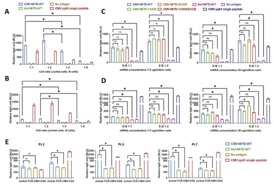 Assessment of the interaction between antigen-specific T cells and IBMAM. (A) Testing Jurkat:B cell ratios for optimal Jurkat (CD8+) cell activation. The CMV-MITD-WT mRNA was electroporated into Pt. 1 B cells (HLA-A*0201), which was used for stimulating Jurkat-CMV-TCR-CD8+. The stimulation with different ratios of Jurkat:B cells underwent 24 h, followed with the luminescence detection from stimulated Jurkat cells. (B) Testing Jurkat:B cell ratios for optimal Jurkat (CD4+) cell activation. The CMV-MITD-WT mRNA was electroporated into Pt. 5 B cells (HLA-DRB1*0701), which was used for stimulating Jurkat-CMV-TCR-CD4+. The stimulation with different ratios of Jurkat:B cells was for 24 h, followed with the luminescence detection from stimulated Jurkat cells. (C) Jurkat (CD8+) cell stimulation assay with Pt. 1 B cells using two Jurkat:B ratios. The mRNA from the corresponding vector templates as mentioned in Figure 2B was produced and electroporated into Pt. 1 B cells, which were subsequently co-incubated stimulating Jurkat-CMV-TCR-CD8+ cells. The experiment was conducted at mRNA concentrations respectively at 7.5 and 30 ug/106 B cells and Jurkat: B cell ratios of 1:1 and 1:2. (D) Jurkat (CD4+) cell stimulation assay with Pt. 5 B cells using two Jurkat:B ratios. The mRNA from the corresponding vector templates as mentioned in Figure 2B was produced and electroporated into Pt. 5 B cells, which were subsequently co-incubated stimulating Jurkat-CMV-TCR-CD4+ cells. The experiment was conducted at mRNA concentrations respectively at 7.5 and 30 ug/106 B cells and Jurkat: B cell ratios of 1:1 and 1:2. (E) Jurkat stimulation assay using B cells from lymphoma patients’ PBMC samples. B cells were isolated from PBMCs from Pt. 2, Pt. 5, and Pt. 7 and immortalized as previously described. The immortalized B cells were electroporated with the CMV-MITD-WT mRNA at 30 ug/106 B cells, and cocultured with Jurkat-CMV-TCR-CD8+ and Jurkat-CMV-TCR-CD4+ at Jurkat:B cell ratio of 1:1 for 24 h before luminescence detection. In Figure 3B–E, negative controls included one group with no mRNA for B-cell electroporation, and the other with electroporation of mRNA from the vector containing Nef full length gene. Positive controls included the CMV pp65 single peptides and CMV peptide pool. See Figure S4. * (p < 0.05).