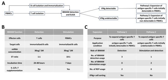 For IFNg+ antigen-specific T-cell expansion, if antigen-specific T cells are first detectable in PBMC samples using initial IBMAM detection, the T cells are extracted from initial PBMCs and a T-cell expansion using rapid expansion procedures (REP) is performed []. Expanded T cells are IBMAM detected for antigen-specificity and then sorted. A second REP is then performed, and double expanded T cells undergo IBMAM detection testing for antigen-specificity. This details pathway 1 of the IBMAM platform (Figure 5).