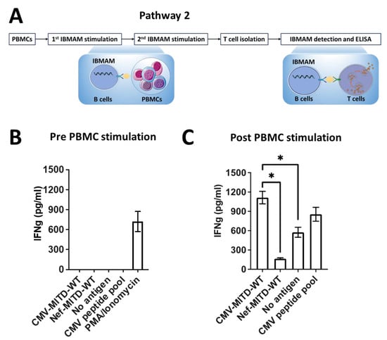 Pathway2: Expansion of antigen-specific T cells initially non-detectable in PBMCs using IBMAM. (A) General schema showing the experimental design for CMV-specific T-cell stimulation. PBMCs from CMV+ ND were stimulated twice with IBMAM before the CD4+ T-cell isolation. The isolated CD4+ T cells were incubated with IBMAM, followed with IFNg secretion detection using ELISA. (B) IFNg detection assay before PBMC and B-cell coculturing. IFNg concentration were detected via co-culturing IBMAM system and CD4+ T cells isolated from PBMCs. (C) IFNg detection assay after PBMC and B-cell coculturing. PBMCs were stimulated with IBMAM involving CMV-MITD-WT at B:PBMC ratio of 1:10 for twice, and CD4+ T cells were subsequently isolated from the stimulated PBMCs and co-incubated with IBMAM for IFNg detection. See Figure S5. * (p < 0.05).
