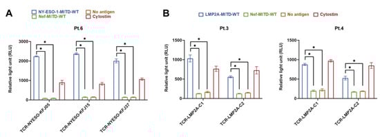 IBMAM platform application to TCR validation. (A) Jurkat stimulation assay testing the TCRs recognizing NY-ESO-160-72. B cells were isolated from PBMCs from Pt. 6 and immortalized as previously described. The immortalized B cells were electroporated with the NY-ESO-1-MITD-WT mRNA at 30 ug/106 B cells and cocultured respectively with Jurkat-TCR-NYESO-KFJ05, Jurkat-TCR-NYESO-KFJ15, and Jurkat-TCR-NYESO-KFJ37 at Jurkat:B cell ratio of 1:1 for 24 h before luminescence detection. (B) Jurkat stimulation assay testing the TCRs recognizing LMP2A484–493. B cells were isolated from PBMCs from Pt. 3 and Pt. 4 and immortalized as previously described. The immortalized B cells were electroporated with the LMP2A-MITD-WT mRNA at 30 ug/106 B cells, and cocultured respectively with Jurkat-TCR-LMP2A-C1 and Jurkat-TCR-LMP2A-C2 at Jurkat:B cell ratio of 1:1 for 24 h before luminescence detection. In Figure 7A,B, negative controls included one group with no mRNA for B-cell electroporation, and the other with electroporation of mRNA from the vector containing Nef full length gene. Positive control included the incubation of Jurkat and B cells with cytostim. See Figure S6. * (p < 0.05).