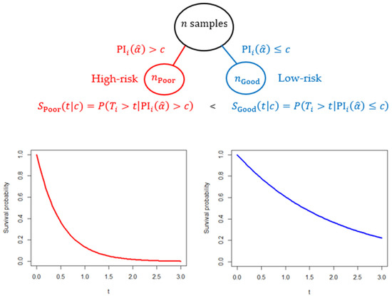 Good and poor prognosis group separated by the PI applied for the testing sample of size n. Concretely, is a good prognosis (low-risk) group, and is a poor prognosis (high-risk) group. If the classification is successful, survival functions exhibit . The cut-off value can be the median of the PI values calculated from the training samples.