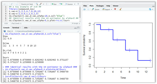 An example of the CG estimator under the Clayton copula is given in Figure 2. Users may run the R code (upper-left panel) after installing the compound.Cox package. Then, the plot of the CG estimates is displayed in the right panel. The numerical values of the estimates (survival probabilities at ) are shown in the lower-left panel. This example uses data 1, 3, 5, 4, 7, 8, 10, 13; 1, 0, 0, 1, 0, 1, 0. The data are artificial data, which may be regarded as patients from a good prognosis group (hence, we specify the S.col =“blue” option to make the plot blue-colored). The Clayton copula’s parameter is specified as (Kendall’s tau is 0.9). If one specifies the copula parameter as , this yields the KM estimator. We see that the numerical results are identical to the results computed by the survfit(.) function (lower-left panel).