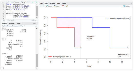 The R console showing the test results for the difference for the good and poor prognoses. The right panel gives the plots of the Clayton CG estimates computed by data 1, 3, 5, 4, 7, 8, 10, 13; 1, 0, 0, 1, 0, 1, 0; 8, 7, 6, 5, 4, 3, 2, 1. The Clayton copula’s parameter is specified as . More detailed results, such as the difference () and the RMSTD (), are given in the left panel.
