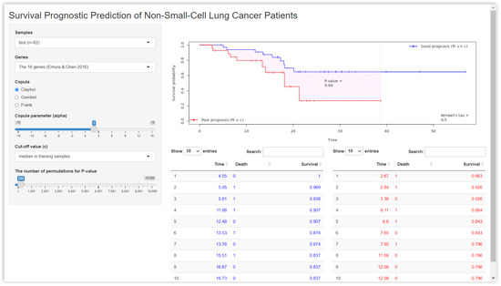 The web application for the sensitivity analysis based on the lung cancer data. The interactive web version is available in https://takeshi.shinyapps.io/lung/ (accessed on 10 January 2023). The main goal of this web application is to visualize how the two prognosis groups are separated by the 16-gene PI for a user-specified choice of (copula) and any value of (copula parameter).