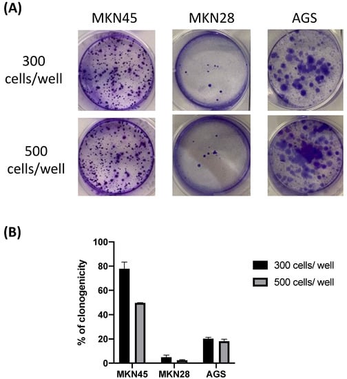 Two weeks after seeding (i.e., 14 days), crystal violet-stained colonies were visualized in all cell lines, with the exception of MKN45, which took 21 days to grow. The ability to form colonies was lower for AGS and MKN28 cells when compared with the MKN45 cells at both densities. Indeed, regardless of the density, MKN28 cells presented the lowest percentage of clonogenicity. The results of the colony formation assays are shown in Figure 3.